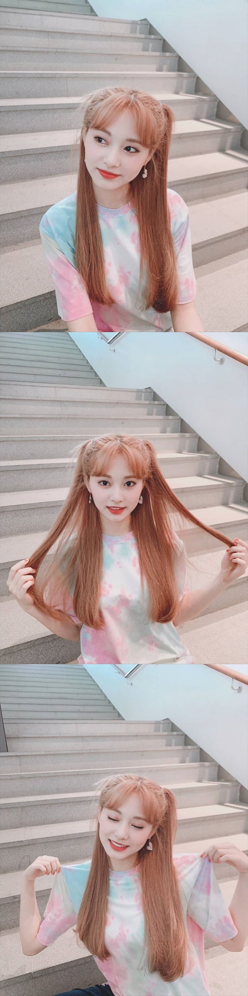 写真の中のツウィは、ハイトーンに染まったロングヘアをハーフツインテールにしている。端正な顔立ちは相変わらずだが、少女のような雰囲気は新鮮さを感じさせる。