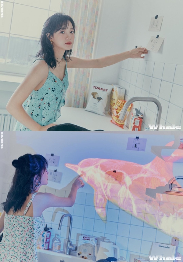 童話の中の1ページのような神秘的な雰囲気を纏うセジョンが、ピンク色のクジラを指さす姿が印象的だ。