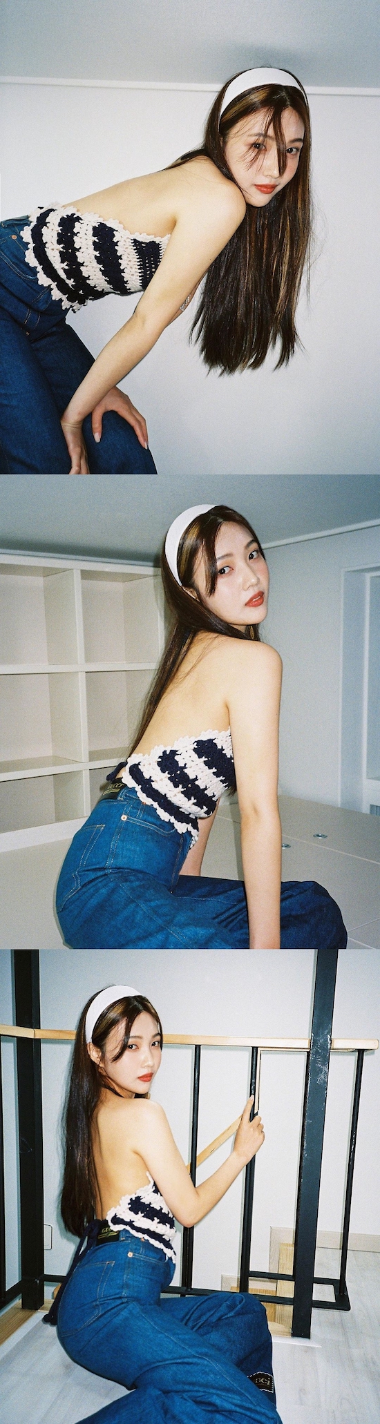 トップスの場合、もともと背中が大きく開いたデザインだが、IUは中に黒のブラトップを着用して肌の露出を控えめにしている。