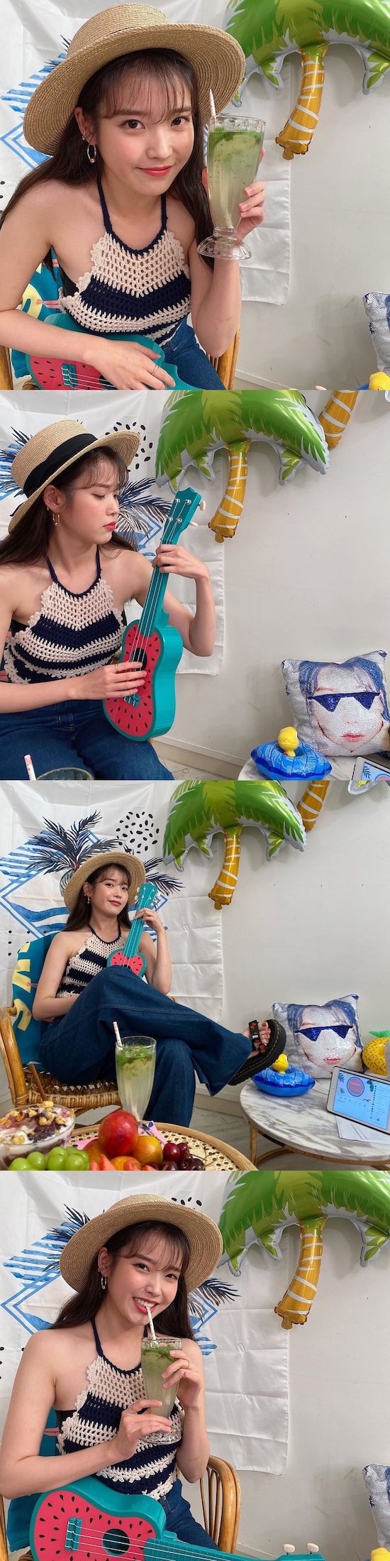 IUは8月12日、「巣ごもりバカンス」をテーマにしたライブ配信を行った。テーマに合わせてニット素材のホールターネックとデニム、麦わら帽子という爽やかなコーディネートで登場したIUは、「レジェンド級」との声が上がるほど可愛らしい様子だった。