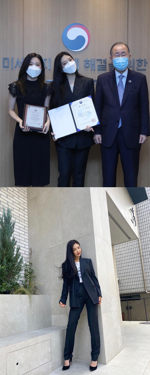 投稿と共に公開された写真には、国家気候環境会議のパン・ギムン委員長の隣で任命状を手にするジョイとスルギの姿が写っている。