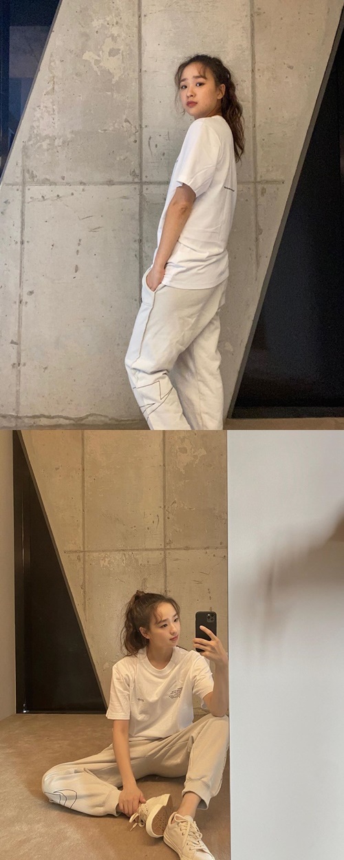 写真を見ると、ソン・ヨンジェがゆったり目の白Tシャツに同系色のスウェット、スニーカーを合わせたラフなコーディネートを軽やかに着こなしている。