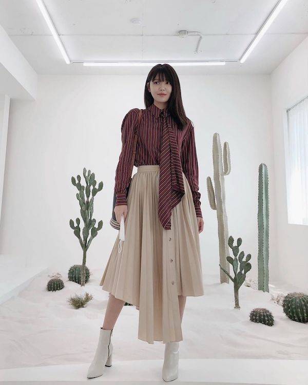 172cmの高身長を誇る彼女は、まるでマネキンのような様子。ミディ丈スカートを見事に着こなし、脚の細長さをさらに際立たせた。