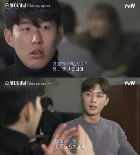 (写真=tvN『ソン・セーショナル-彼を作った時間』放送画面キャプチャ)ソン・フンミン(上)と話を交わすパク・ソジュン