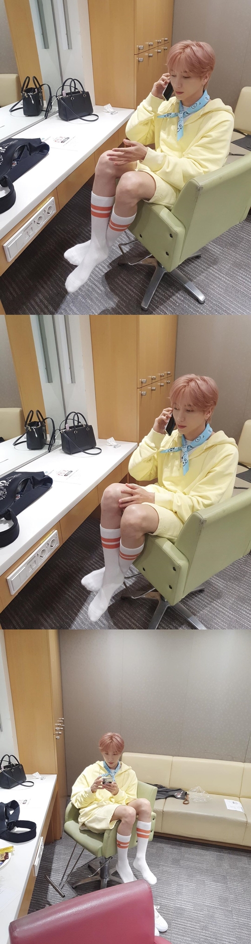 写真の中のイトゥクは、楽屋と思しき場所で電話をかけているようだ。パステルイエローのセットアップにスポーツテイストのソックス、水色のスカーフと、身に着けたアイテムはいずれも少年らしさを漂わせている。