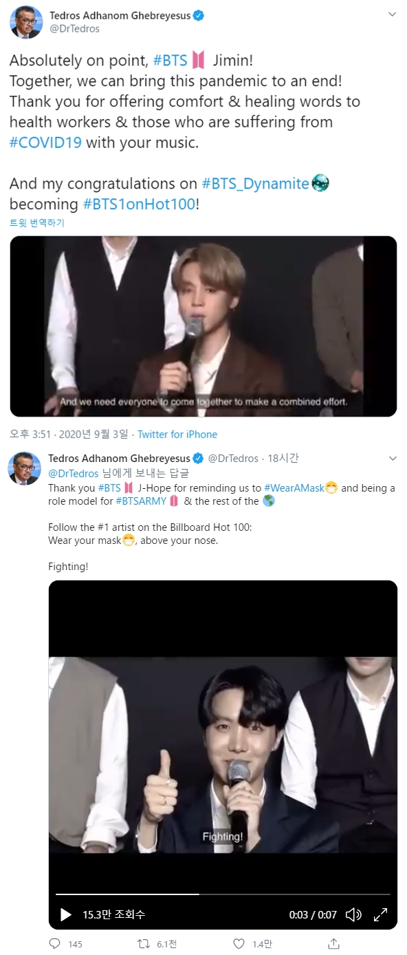 テドロス・アダノムWHO事務局長は9月3日、自身のTwitterに「J-HOPEがマスク着用を呼び掛けた。 BTSとARMY、全世界に良いお手本になってくれてありがとう」と挨拶した。
