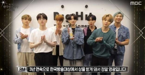 BTSは9月10日、MBCで生中継された「第47回韓国放送大賞授賞式」で歌手賞を受賞し、映像でコメントを寄せた。