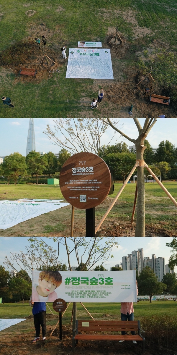 JUNG KOOKの個人ファンクラブ「everything is ok」とソウル環境運動連合は9月29日、蚕室(チャムシル)の漢江(ハンガン)公園付近にエノキ3本、シジミバナ200本を植え、「JUNG KOOK森 3号」を作った。