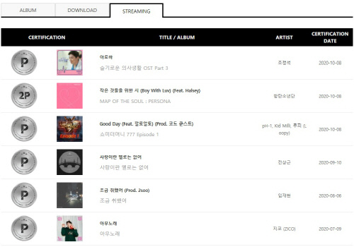 10月13日、チョ・ジョンソクの所属事務所JAMエンターテインメントによると、彼が直接歌った『賢い医師生活』のOST『アロハ』は最近、累計ストリーミング再生数が1億回を突破し、ストリーミング部門の“プラチナ認証”リストに名前を連ねた。