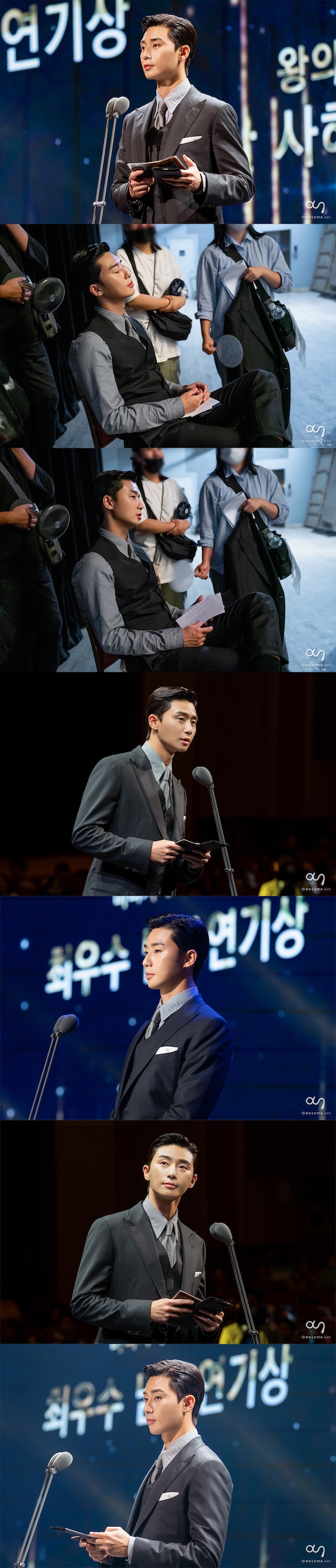 スーツを着こなして撮影に臨むパク・ソジュンは、優れたビジュアルとフィジカルを見せつけている。さらには抜群のオーラと存在感を放ち、ドラマに華を添える様子だ。