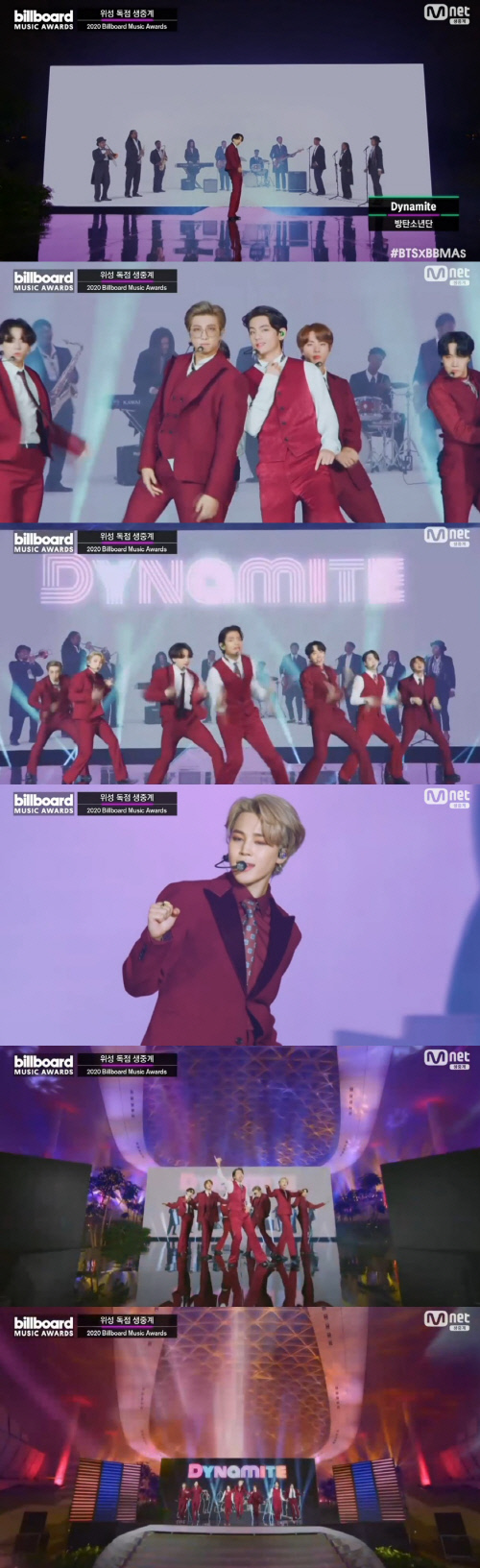 BTSはビルボードのメインシングルチャート「ホット100」で7週連続で最上位圏をキープしている『Dynamite』のステージも披露した。7人のメンバーが披露した華麗なパフォーマンスと熱い情熱が「ビルボードミュージックアワード」のステージを盛り上げた。