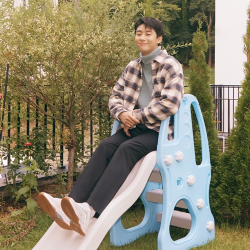写真の中のパク・ソジュンは、カジュアルな装いで滑り台に座っている。冬の訪れを感じさせるニットをメインにしたコーディネートからは、温かい人柄が伝わってくるようだ。