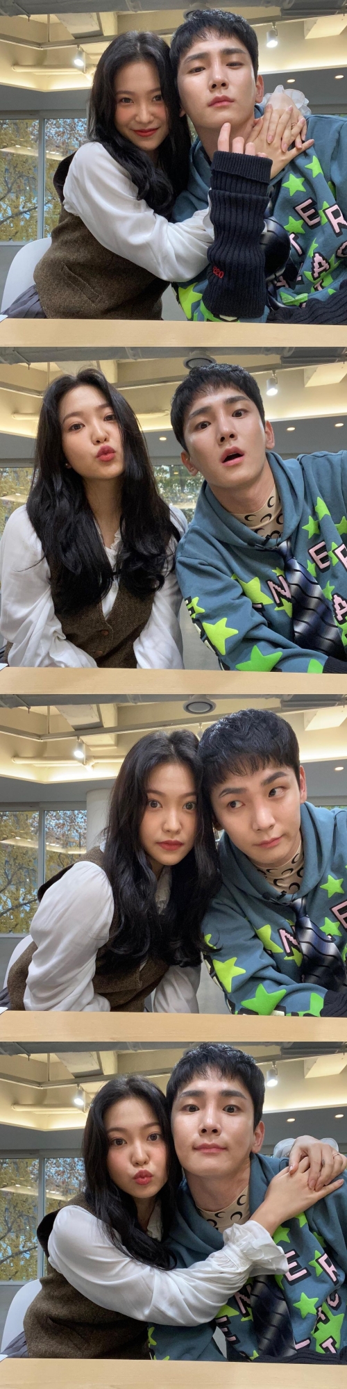 写真には、イェリとキーの姿が写っている。 2人は肩を寄せ合いながら、口を開けたままカメラを見つめたりとお茶目な表情で見る者を虜にした。