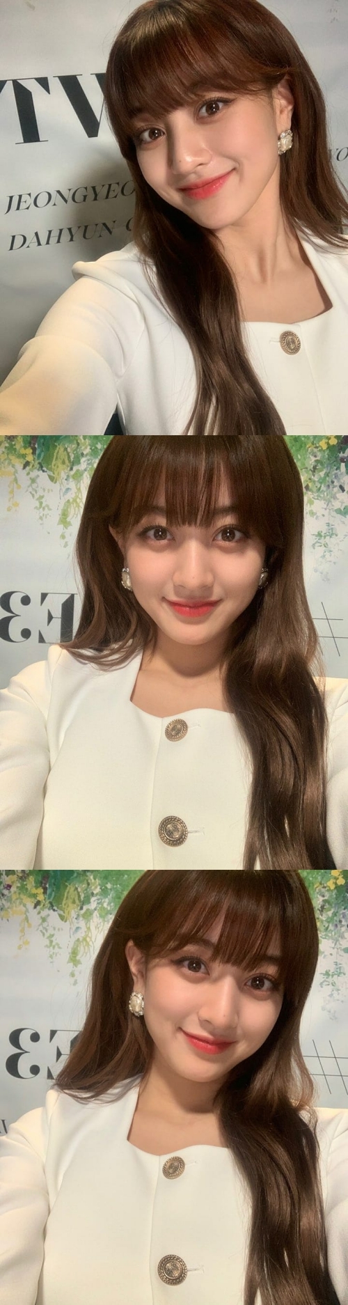 投稿された写真には、金ボタンがポイントのホワイトトップスにビジューのイヤリングをしたジヒョが写っている。