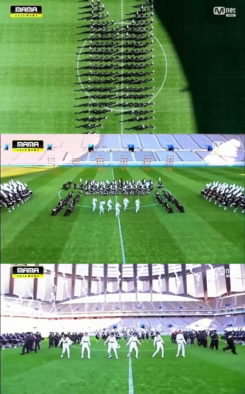 ソウル上岩(サンアム)ワールドカップ競技場で事前収録されたまず『ON』では、大勢のマーチングバンドとコラボしながら壮大なスケールに仕上げた。気概あふれるダンス、AR(拡張現実)技法、花火効果などを融合させ、ファンを魅了した。
