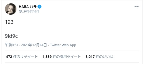 12月14日、ク・ハラさんの公式ツイッターには「123、9ld9c」というコメントが投稿された。