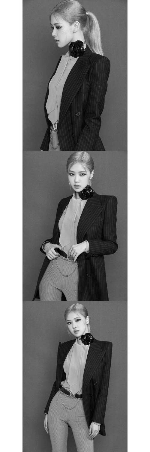公開された写真には、カメラを見つめるロゼのモノクロ写真が写っている。モデルさながらの表情とポーズ、圧倒的なオーラが印象的だ。