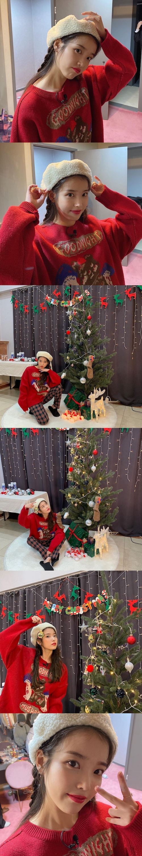 写真の中のIUは、赤いニットにチェック柄パンツ、もこもこ素材の帽子といった格好。クリスマス雰囲気たっぷりの空間でポーズをとりながら遊んでいる様子が、ファンを微笑ませた。