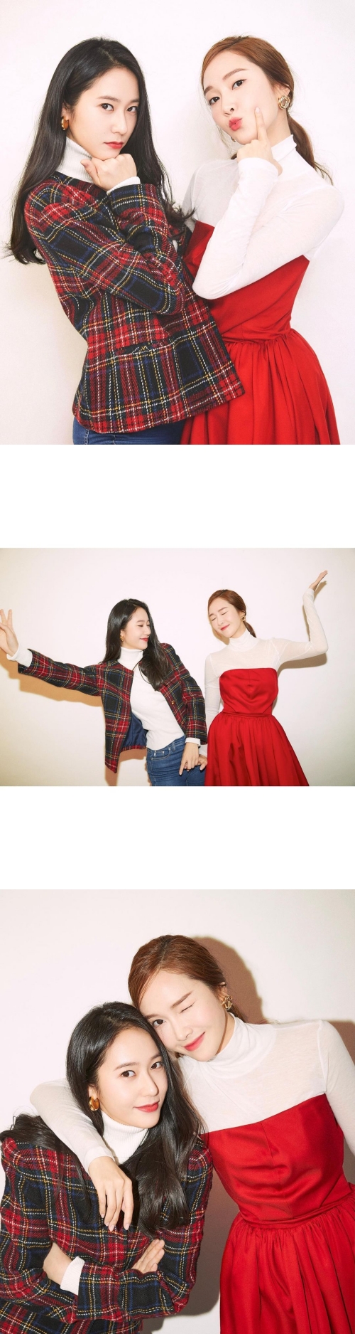2人はチェックのジャケットと真っ赤なドレスというクリスマスコーデに身を包み、さまざまなポーズを決めてカメラを見つめている。