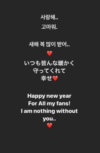 ストーリーに「愛してる。ありがとう。新年明けましておめでとう」と韓国語で綴り、ファンに新年のあいさつを伝えた。
