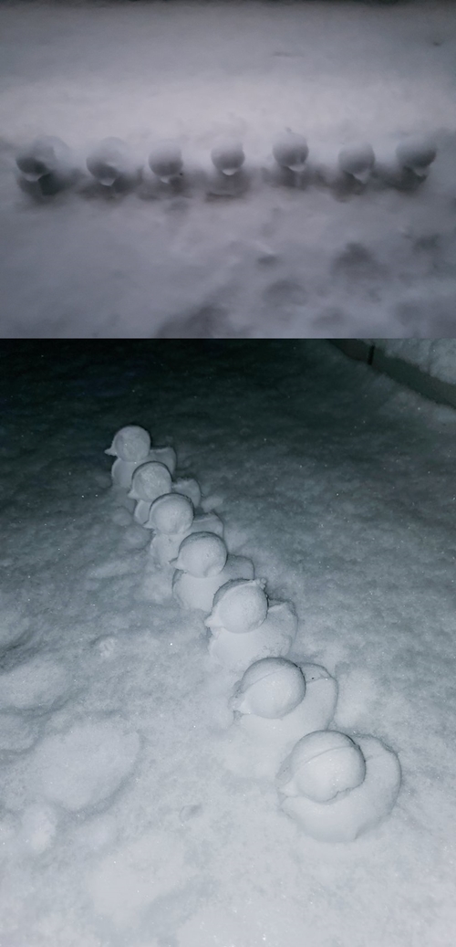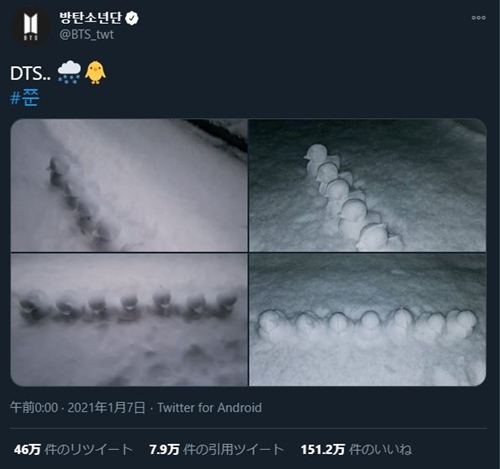 写真には、雪で作られたアヒルが7体写っている。これはBTSメンバーの人数と同じ数で、“DTS”は「Duck」と「BTS」を合わせた造語のようだ。韓国では1月6日時点で大雪が降っており、多くの芸能人が雪の日を楽しむ姿でファンを喜ばせていた。