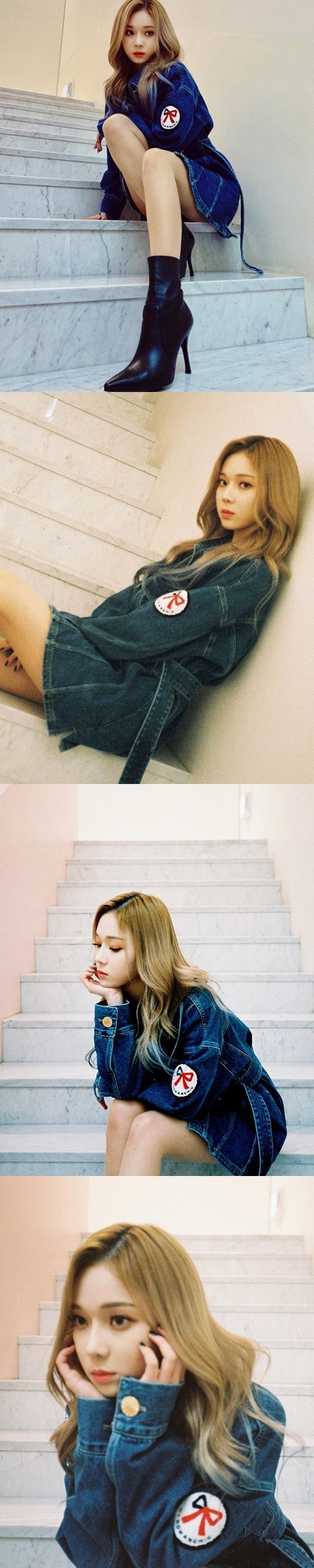 白い大理石の階段で撮られたこの写真は、WINTERの白い肌とマッチしており、虚空を見つめる表情が印象的だ。