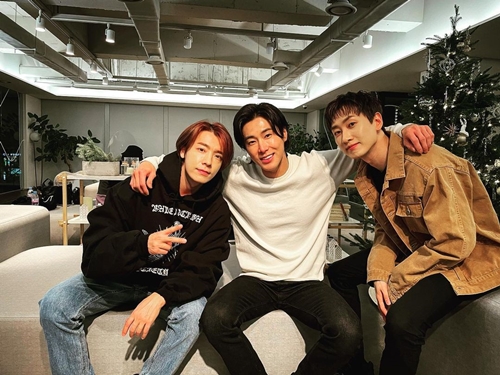 写真の中のユンホは、両脇に座るドンヘとウニョクの肩を組んで笑顔を浮かべている。ユンホとドンへは同時期に練習生としてSMエンターテインメントに加入し、地元も近いことから本当の兄弟のように親しい間柄だ。