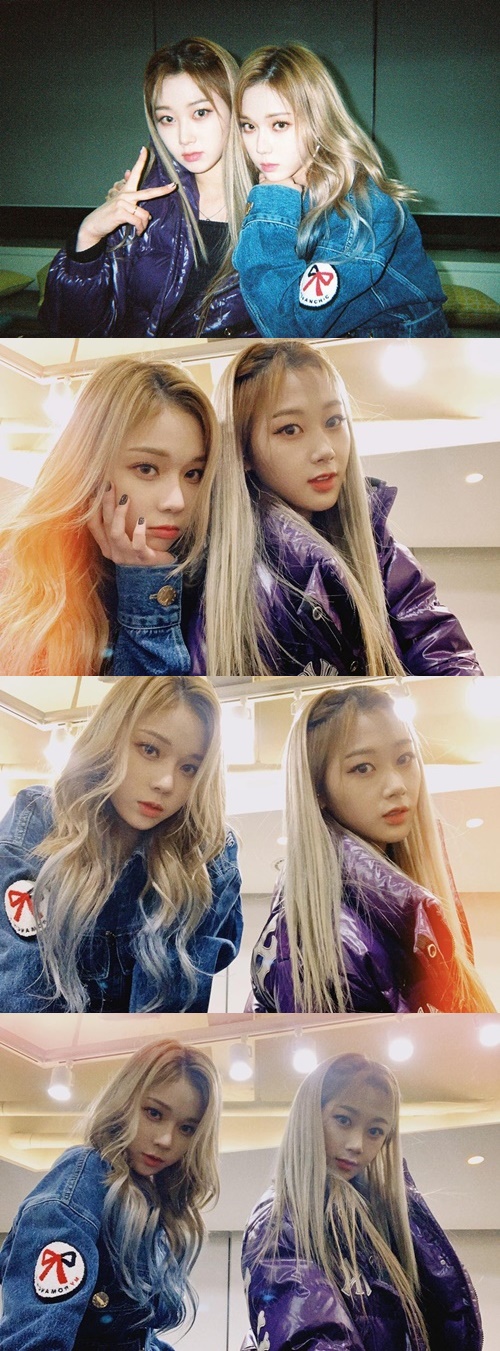写真に写っている2人はヘアカラーをゴールドで揃え、WINTERはデニムのトップス、GISELLEはパープルカラーのシャイニーなダウンアウターをまとっている。