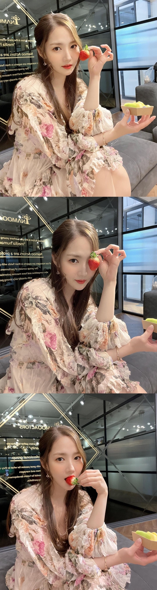 写真の中のパク・ミニョンは上品な花柄のワンピースに身を包み、苺を片手にカメラを見つめている。普段は気品あふれる大人の美貌でファンを魅了するパク・ミニョンだが、みずみずしさを感じさせるキュートな魅力も見る者を惹きつけて離さない。