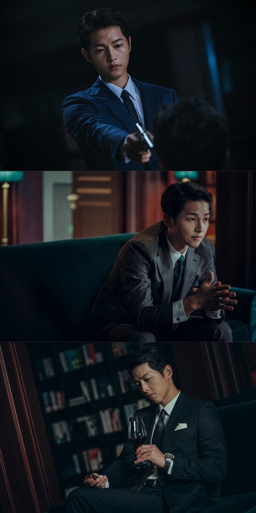 書斎に座ってワイングラスを持って考えにふけるヴィンチェンツォは、上品で清潔なスーツ姿で、「カサノファミリー」の戦略家らしい節制されたカリスマ性が感じられる。また魅力的な外見とは異なり、誰かに銃を向ける彼の感情が排除された冷たい顔は緊張感を与える。交渉を主導する余裕のある微笑みと鋭利に光る目つきにも、彼の非凡さを垣間見ることができるだろう。