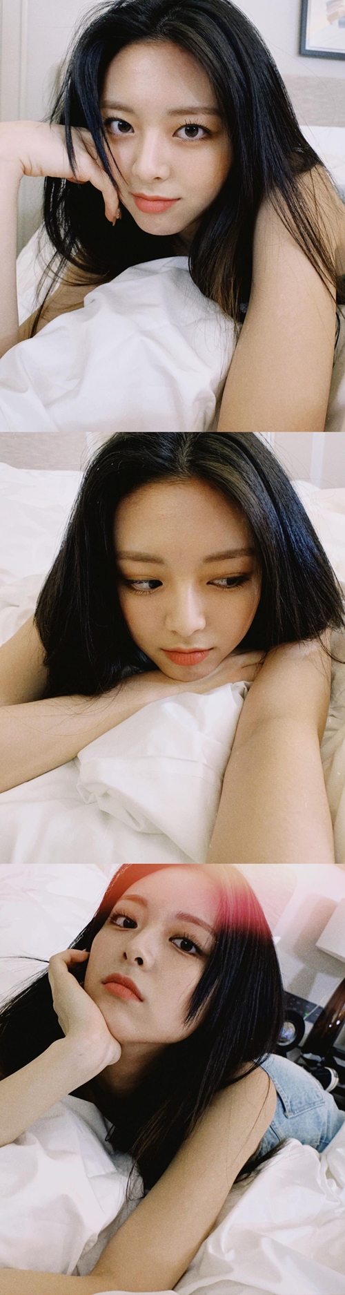 写真の中のユナは、ベッドに寝そべってリラックスムードを漂わせている。クールな印象を与えるロングヘアとはっきりとした目鼻立ちは、とても17歳とは思えない美しさだ。