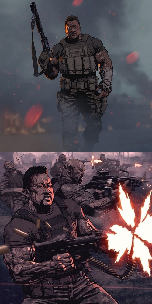 コメントとともに自身が描かれたコンセプトアートも掲載。今にも張り裂けそうな筋肉で銃を乱射しているイメージアートが、世界中のファンを熱くし、どのようなアクションとストーリーが盛り込まれるのか注目を集めている。