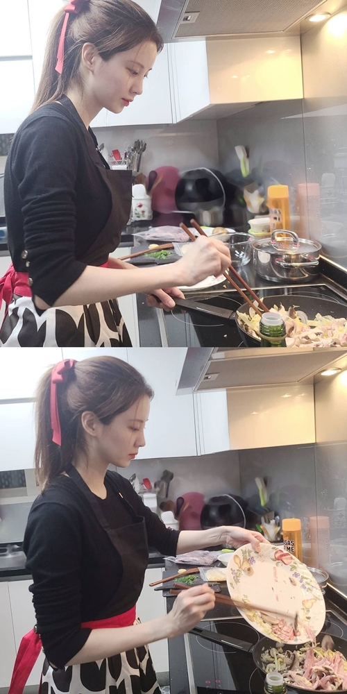 写真の中のソヒョンは、長い髪をポニーテールにまとめ、エプロン姿で熱心に料理を作っている。リアルな私生活を切り取ったような、自然体の表情がなんとも魅力的だ。
