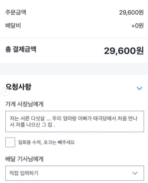 注目されたのは、注文時に送ることができるオーナーへのメッセージだ。T.O.Pはコメント欄に「私は35歳…母と父が〇〇〇(店名)で初めて出会い、私を産んでくれたお店」というメッセージを書き込んだ。