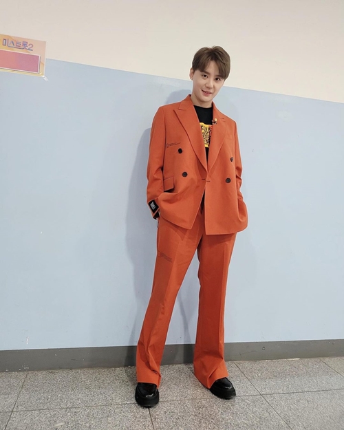 写真の中のジュンスは、Tシャツで抜け感を与えたジャケットスタイルを披露しているのだが、何よりも目を引くのはその色合いだろう。全身オレンジ色という奇抜なカラーにもかかわらず、まるでジュンスのために作られたかのように似合っている。