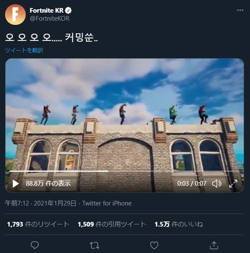 1月29日、人気オンラインゲーム「フォートナイト」の公式ツイッターには、ゲーム内で購入できる新アイテムの告知が掲載され、多くのユーザーを沸かせた。