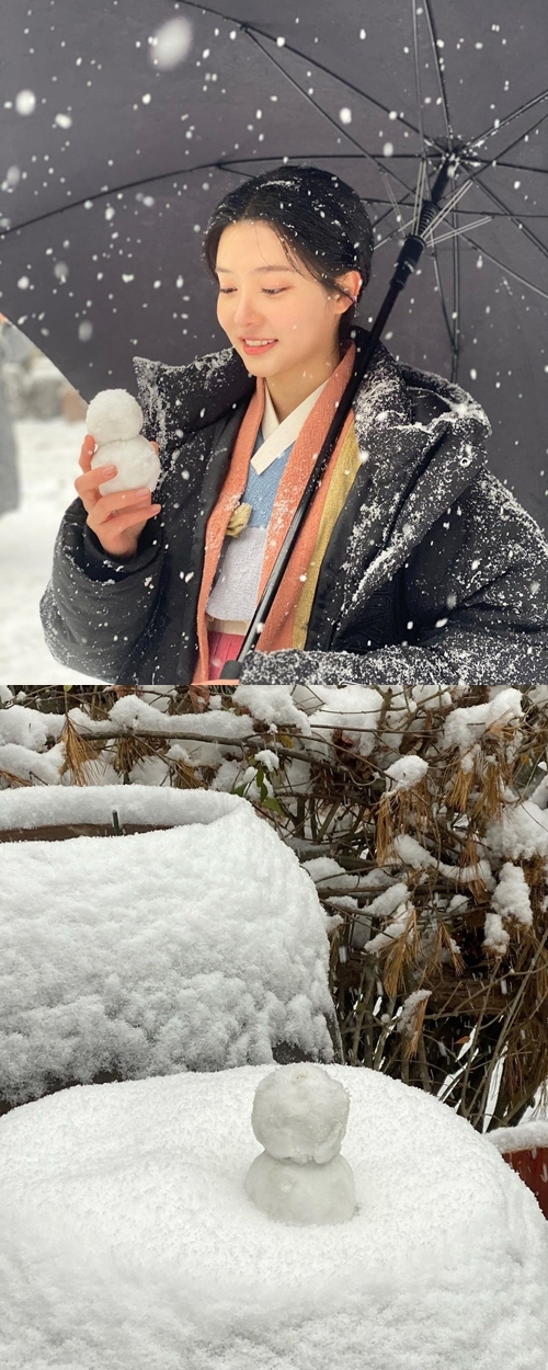 写真に写っているチョ・スミンは、時代劇衣装である韓服の上からベンチコートを着用して傘をさしているものの、防ぎきれない雪が服に付着。しかし、その雪が彼女の美しさを彩る見事なアクセントに。