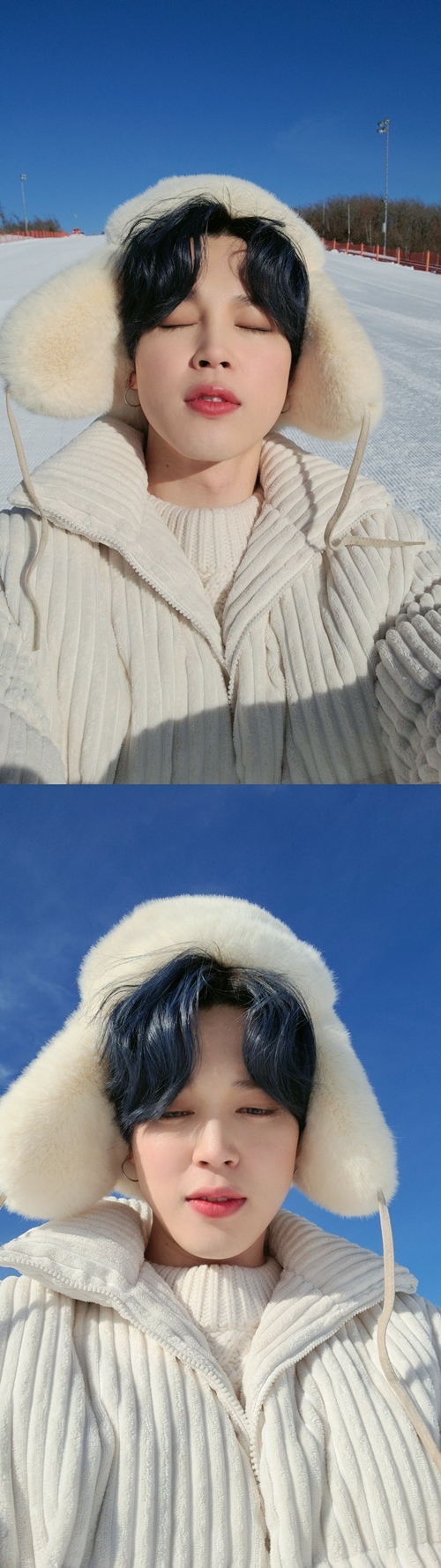 写真の中のJIMINは、真っ白な雪景色の中で柔らかな表情を浮かべている。カメラに向かって口をすぼめる姿はまるでキスを誘っているかのようで、彼ならではの茶目っ気もうかがえる。積もった雪に負けない、透き通るような白い肌も印象的だ。