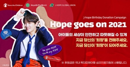 J-HOPEのファンアカウント「HopeOnTheWorld」と、子供たちのための国際援助団体NGOである「Save the Children」は、去る1月18日から虐待児童支援キャンペーン「Hope goes on 2021」を行っていることを明らかにした。