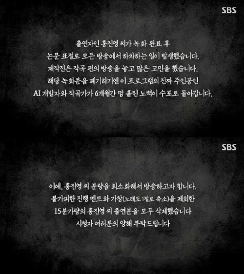この日の放送で制作陣は「出演者のホン・ジニョン氏が収録完了後、論文盗作ですべての放送から降板すること事態が発生しました。制作陣は作曲編の放送を巡り、大いに悩みました。該当の収録分を廃棄するとなれば、この番組の本当の主人公であるAI開発者と作曲家が、6カ月間にわたり汗を流した努力が水の泡となる」と語った。
