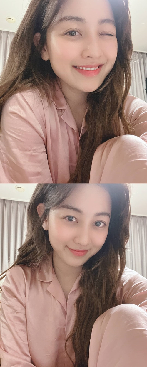 写真の中のジヒョは、かわいらしいピンクのパジャマ姿で無邪気な表情を見せている。まったくメイクをしていない状態にも関わらず、はっきりとした目鼻立ちが印象的だ。
