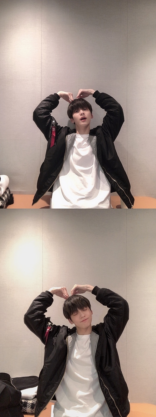 本日は、TXTがミニアルバム『THE DREAM CHAPTER:STAR』をリリースしてデビューした日。写真の中のSOOBINは、両手を使ってハートを作りながら無邪気な表情を浮かべている。