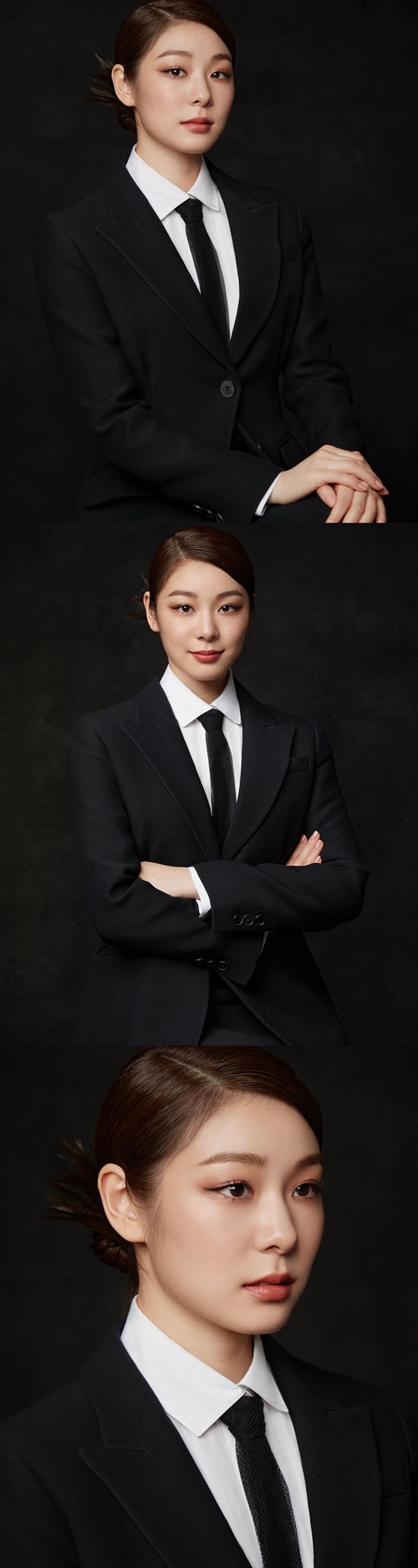 投稿された写真の中のキム・ヨナは黒のスーツを着用して凛とした雰囲気をかもしだしている。透け感のある素材のネクタイや、強い眼差しを強調するようなメイクもなんともスタイリッシュだ。