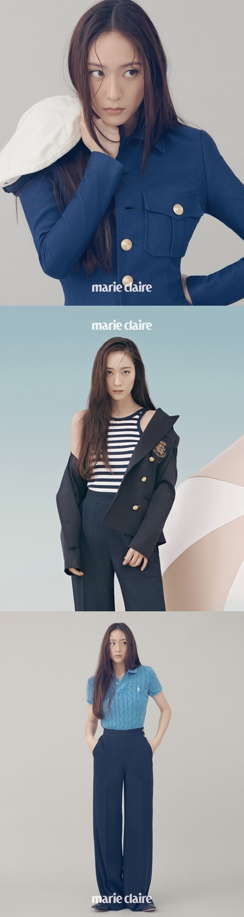 ファッションマガジン『marie claire』が公開したビジュアルのクリスタルは、ダブルブレザー、ストライプ柄トップスのようにクラシックなアイテムを見事着こなし、ブランドの魅力を際立たせている。