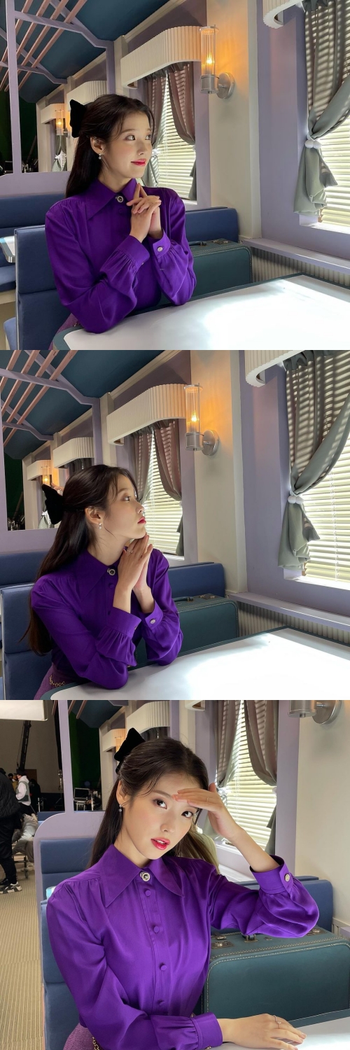 投稿された写真には、ミュージックビデオ撮影中のIUの姿が写っている。IUは鮮やかな紫色のブラウスを着用し、大きなリボンが可愛らしいヘアスタイルで童話の中の少女のようだ。
