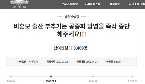 去る3月29日、韓国大統領ホームページに設置された国民請願の掲示板には、「非婚母の出産を助長させる地上波放送を直ちに中断してください」というタイトルの文章が投稿された。