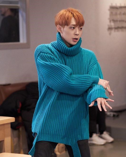 公開された写真には、振り付け練習に励むユチョンの姿が写る。ブルーグリーンのニットに黒のジーンズを合わせたコーディネート、オレンジ色のヘアカラーが相まって、爽やかな美男子ぶりを際立たせた。