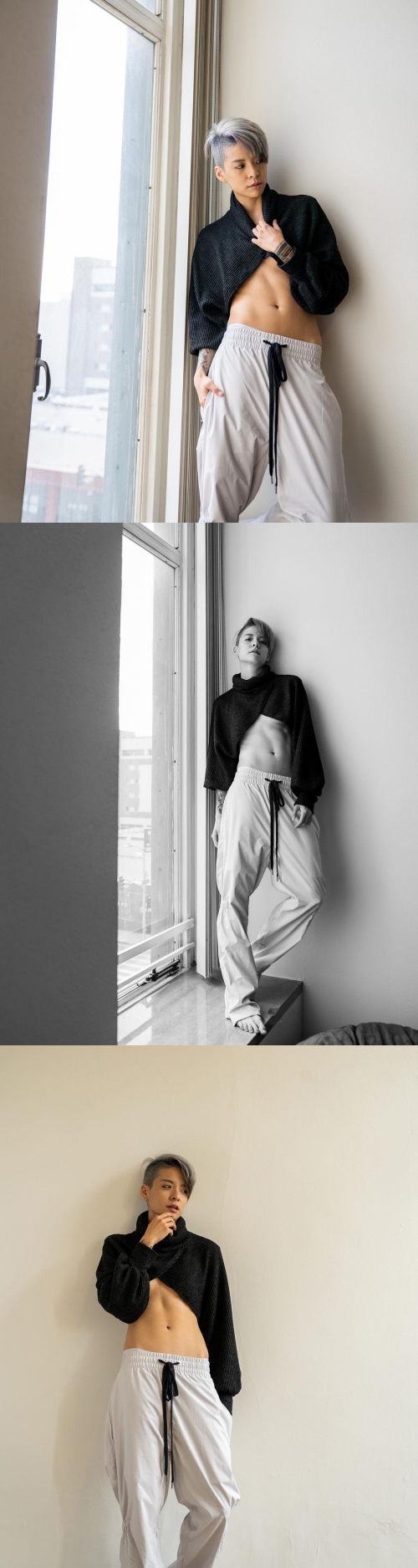 公開された写真には、ニットにジャージ姿のエンバが写っている。銀髪のショートカットがシックな雰囲気を醸し出している。しっかりとした腹筋とクールな表情が相まって「ガールクラッシュ」の魅力を存分に発揮した。