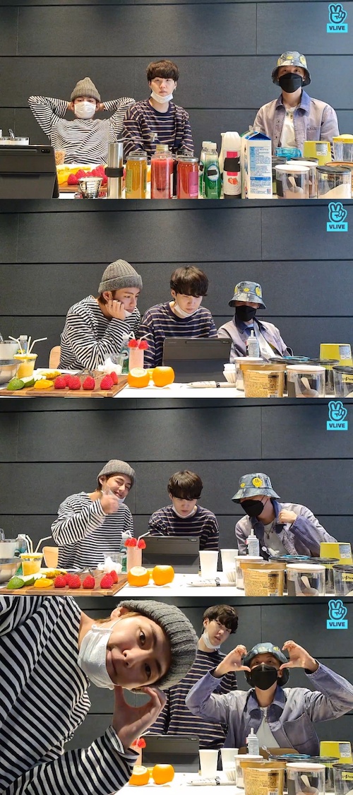 「バンタンカフェ龍山店OPEN!ARMYと一緒にティータイム」と題したこの日のライブ配信にはV、SUGA、J-HOPEの3人が登場。