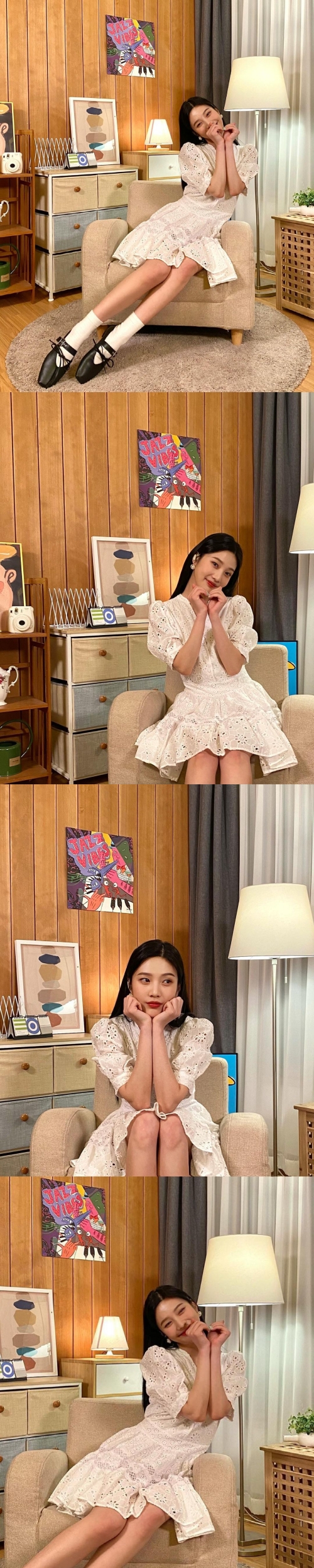 写真の中のジョイは、手でハートを作りながらカメラを見つめ、にっこりと微笑んでいる。総レース素材のワンピースを着用したジョイは、清純な雰囲気を纏い、魅力的だ。スカートからのぞくスラリと伸びる美脚は見る者を虜にした。